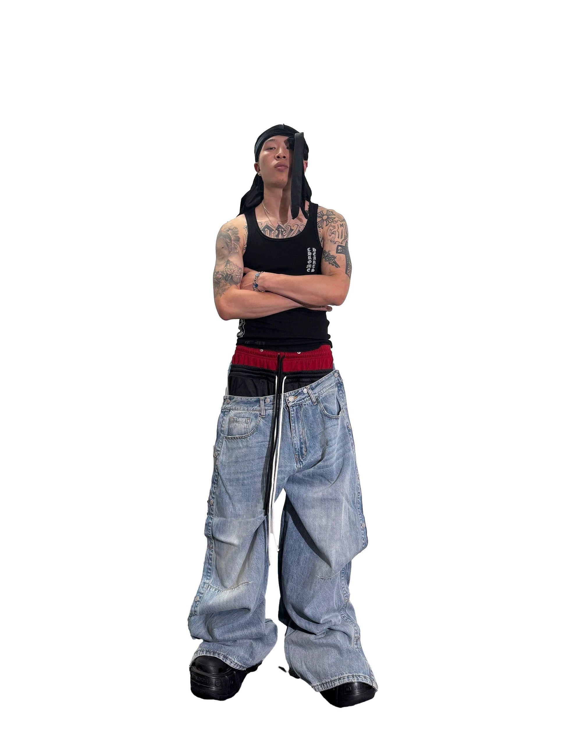 High-quality imported denim fabric; the lining uses knitted red fabric and composite fabric to create a MULTI-SAGGIN visual effect.
